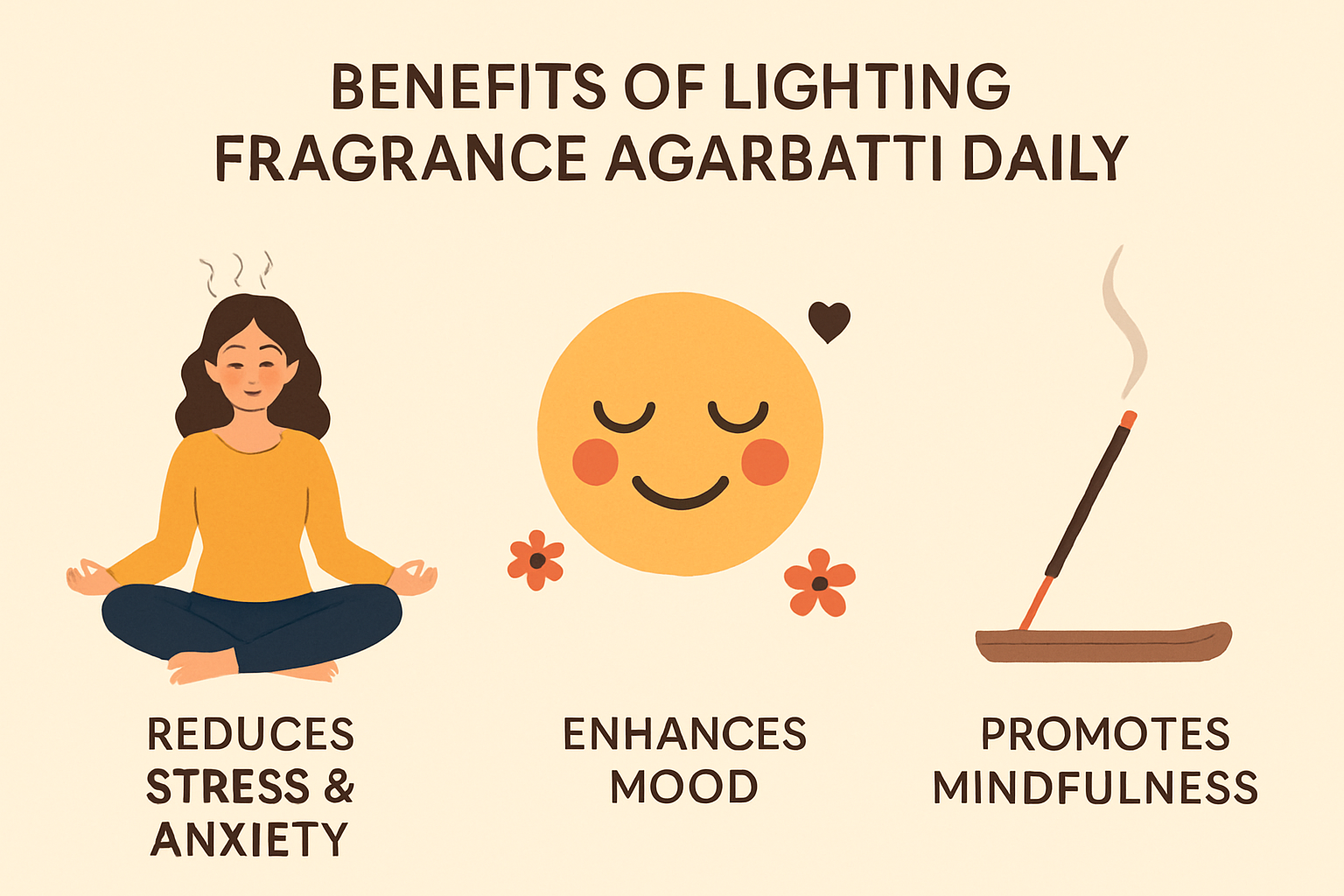 Mental & Emotional Benefits Reduces Stress & Anxiety: Fragrance like sandalwood, lavender, or jasmine has calming effects that help relax